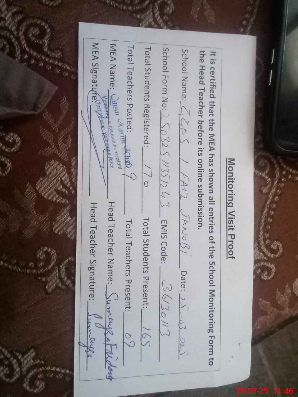 | Name: Ir**** Az Designation: (School Headmaster's/Headmistress's) HEADMISTRESS Phone/Cell Number: 03**** |