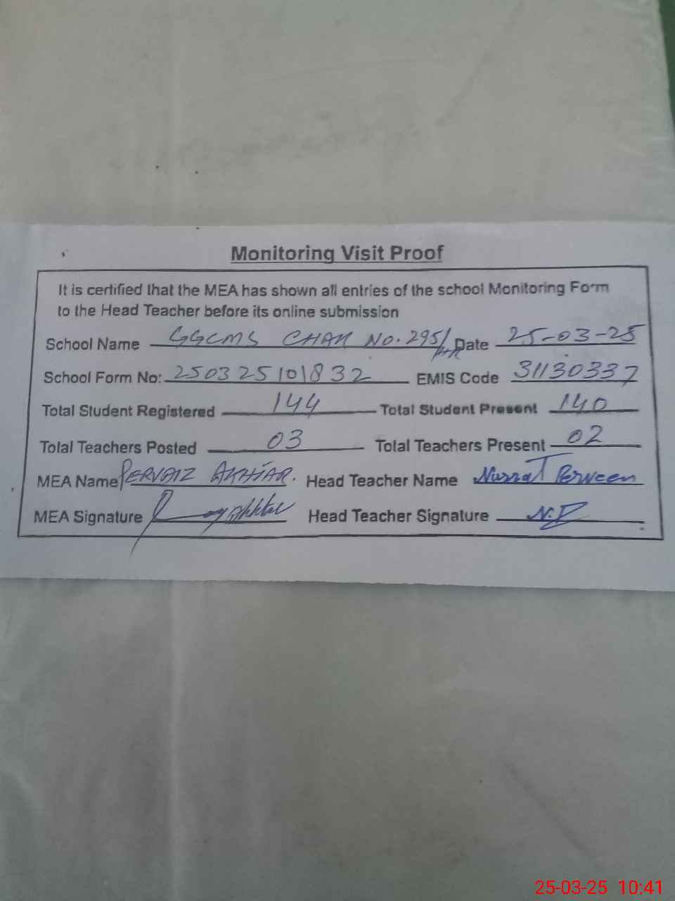 | Attendance Register | Head Teacher | MEA with School | Visit Proof |