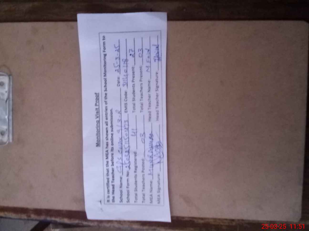 | Attendance Register | Head Teacher | MEA with School | Visit Proof |