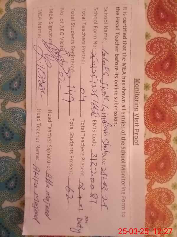 | EMIS Code: 31320081 | Name of School: GGES JHOK GHULAB SHAH | |||