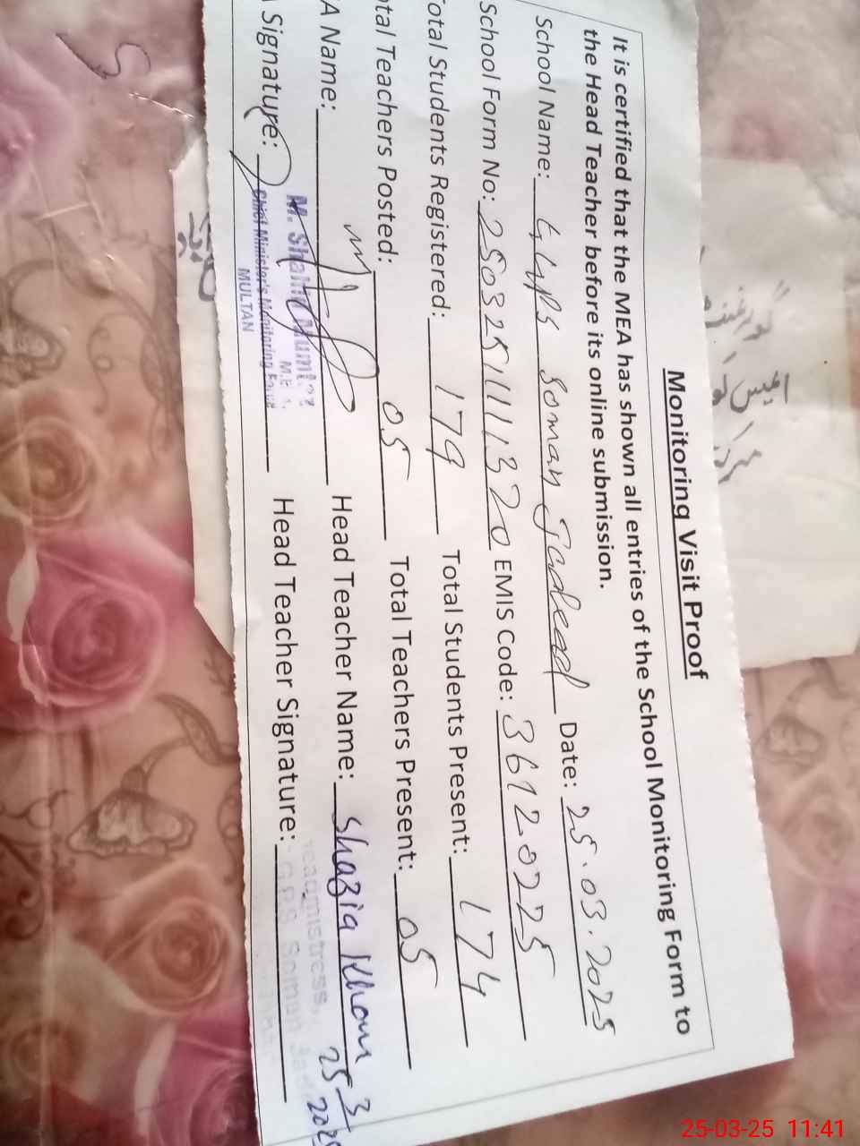 | Certified that this School was Inspected by the Undersigned MEA/DMO Today and the Information Stated Above is as Per Record. | |||||