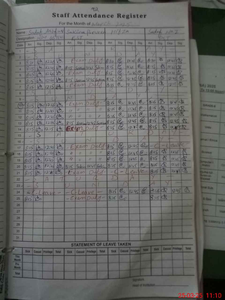 | 35**** | Sa**** Pa**** | Regular | 2 | 0 | 0 | 0 | 0 | 0 | 0 | 0 | 2 | Exam Duty | |