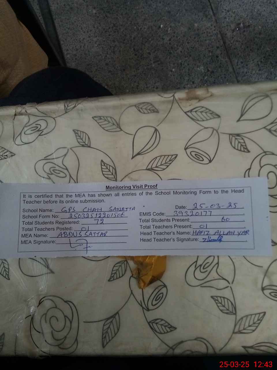 | Attendance Register | Head Teacher | MEA with School | Visit Proof |