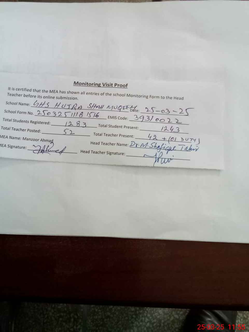 | Certified that this School was Inspected by the Undersigned MEA/DMO Today and the Information Stated Above is as Per Record. | |||||