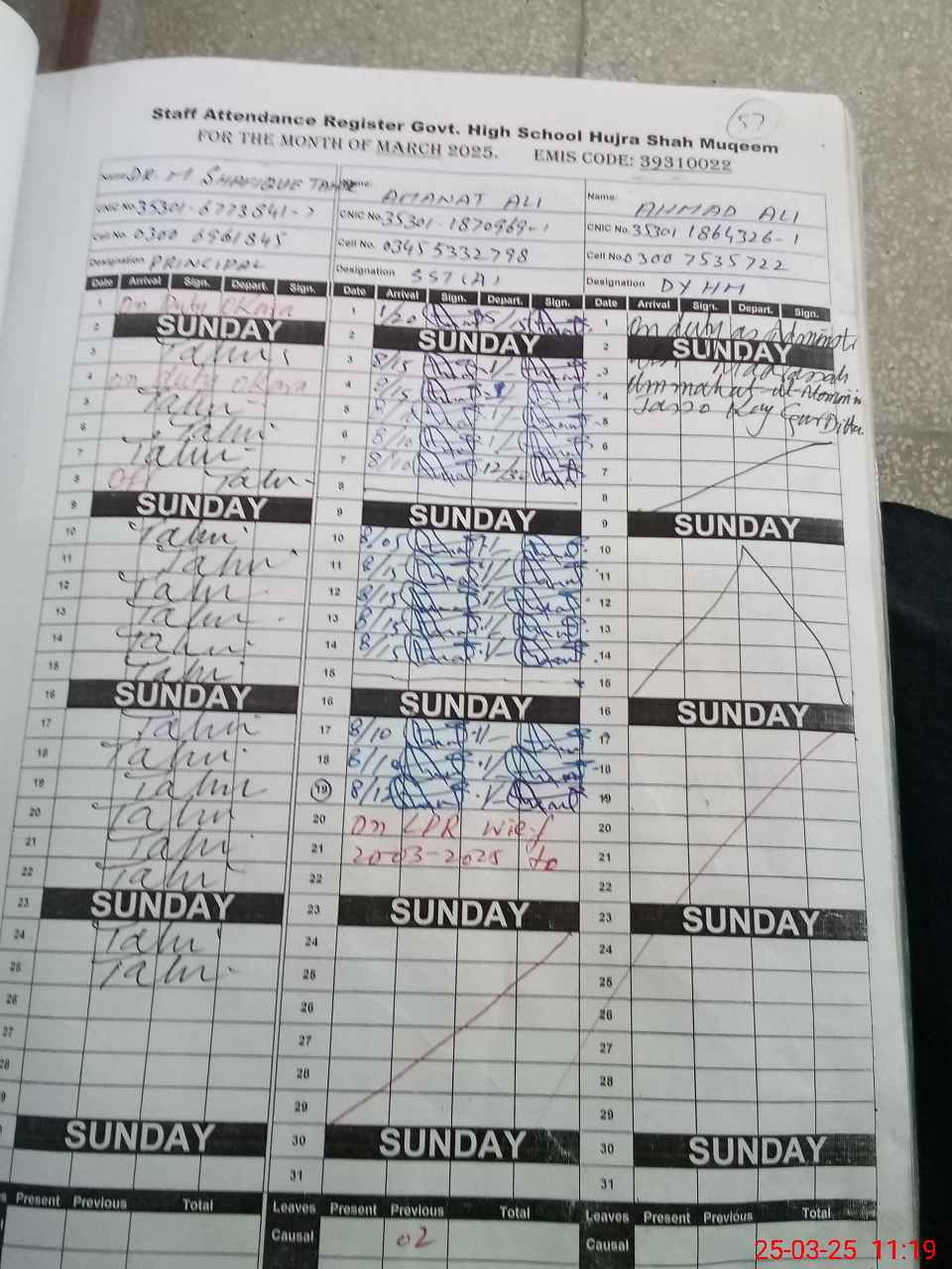 | CNIC | Full Name | Designation | R/C | Absence during last cal. month |