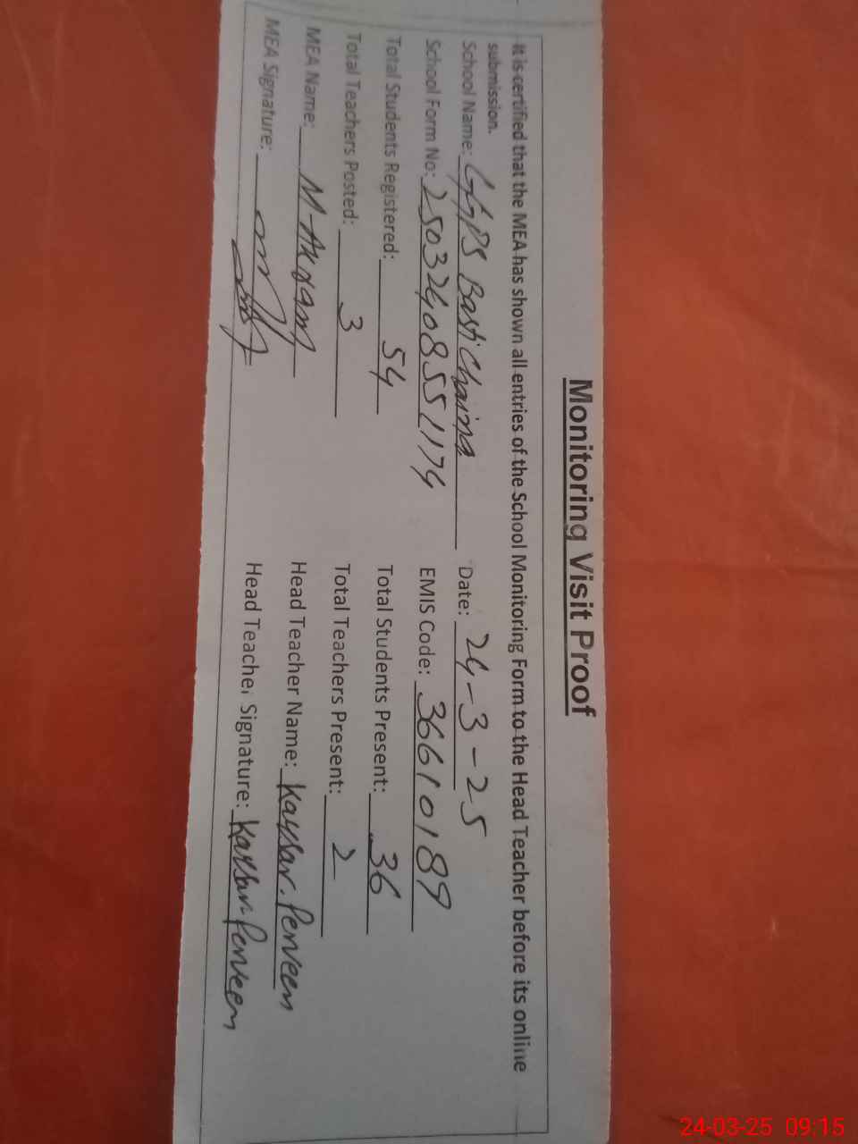 | Attendance Register | Head Teacher | MEA with School | Visit Proof |
