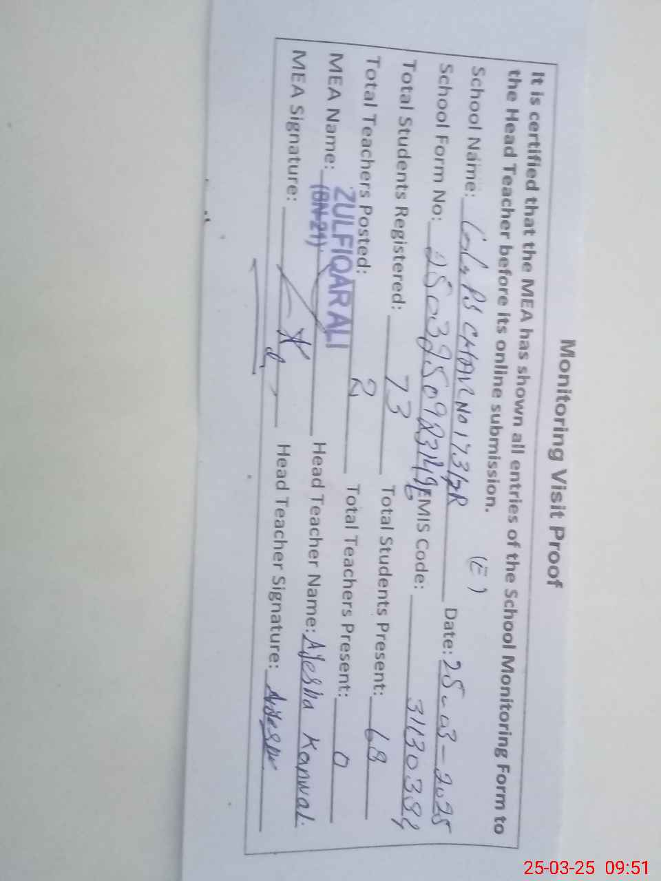| Attendance Register | Head Teacher | MEA with School | Visit Proof |