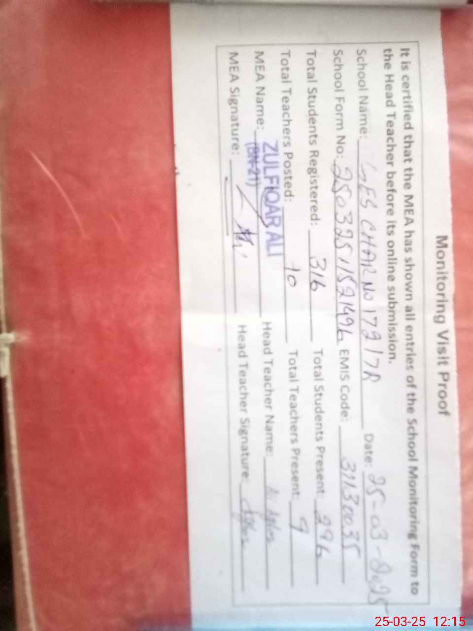 | Attendance Register | Head Teacher | MEA with School | Visit Proof |