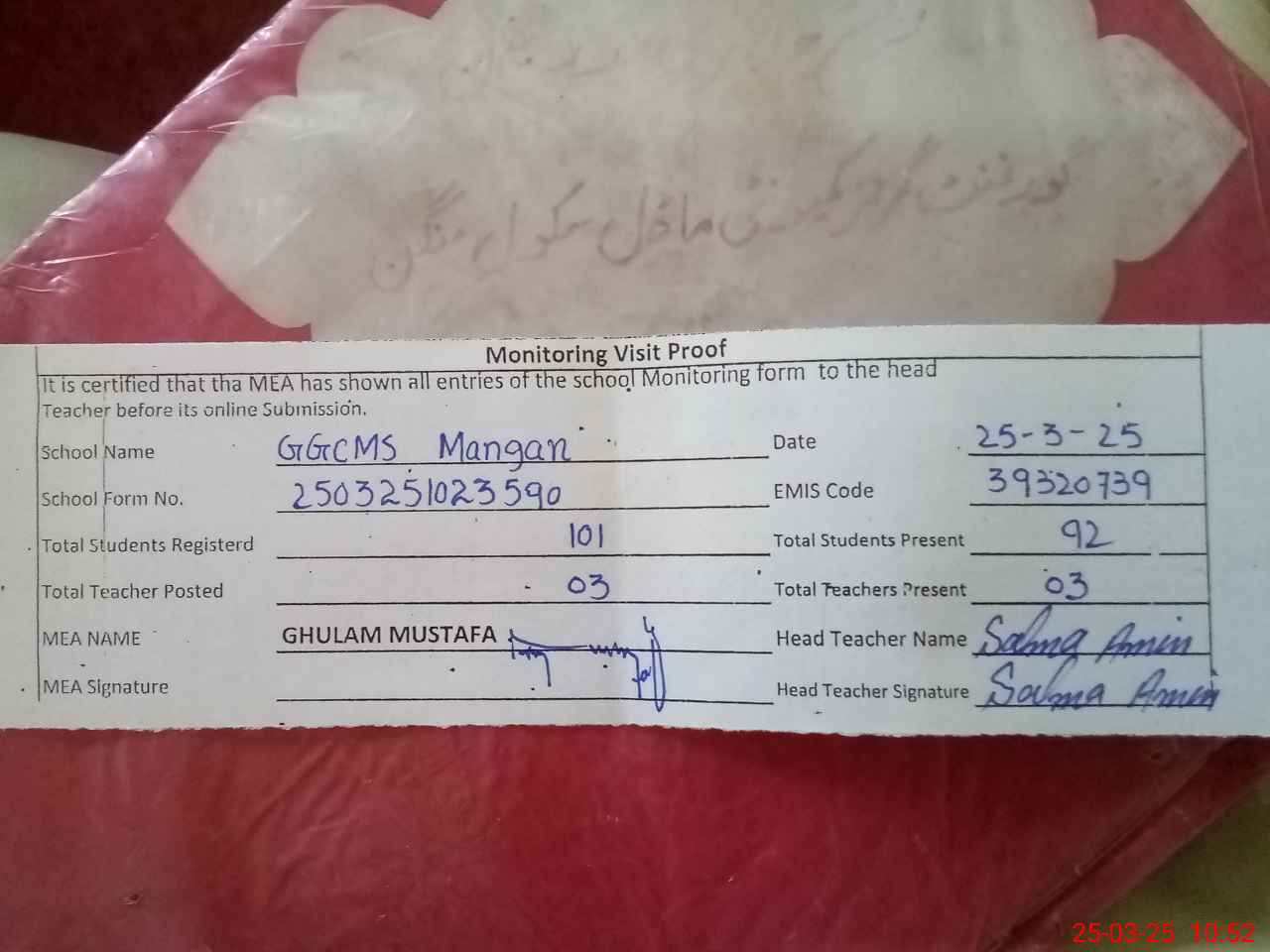 | Attendance Register | Head Teacher | MEA with School | Visit Proof |