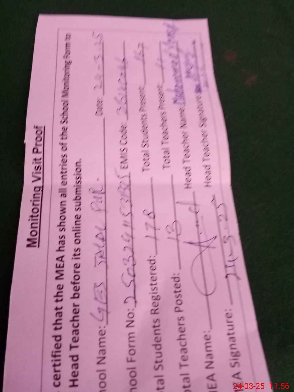 | Attendance Register | Head Teacher | MEA with School | Visit Proof |