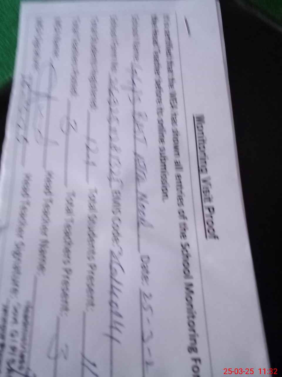 | Attendance Register | Head Teacher | MEA with School | Visit Proof |