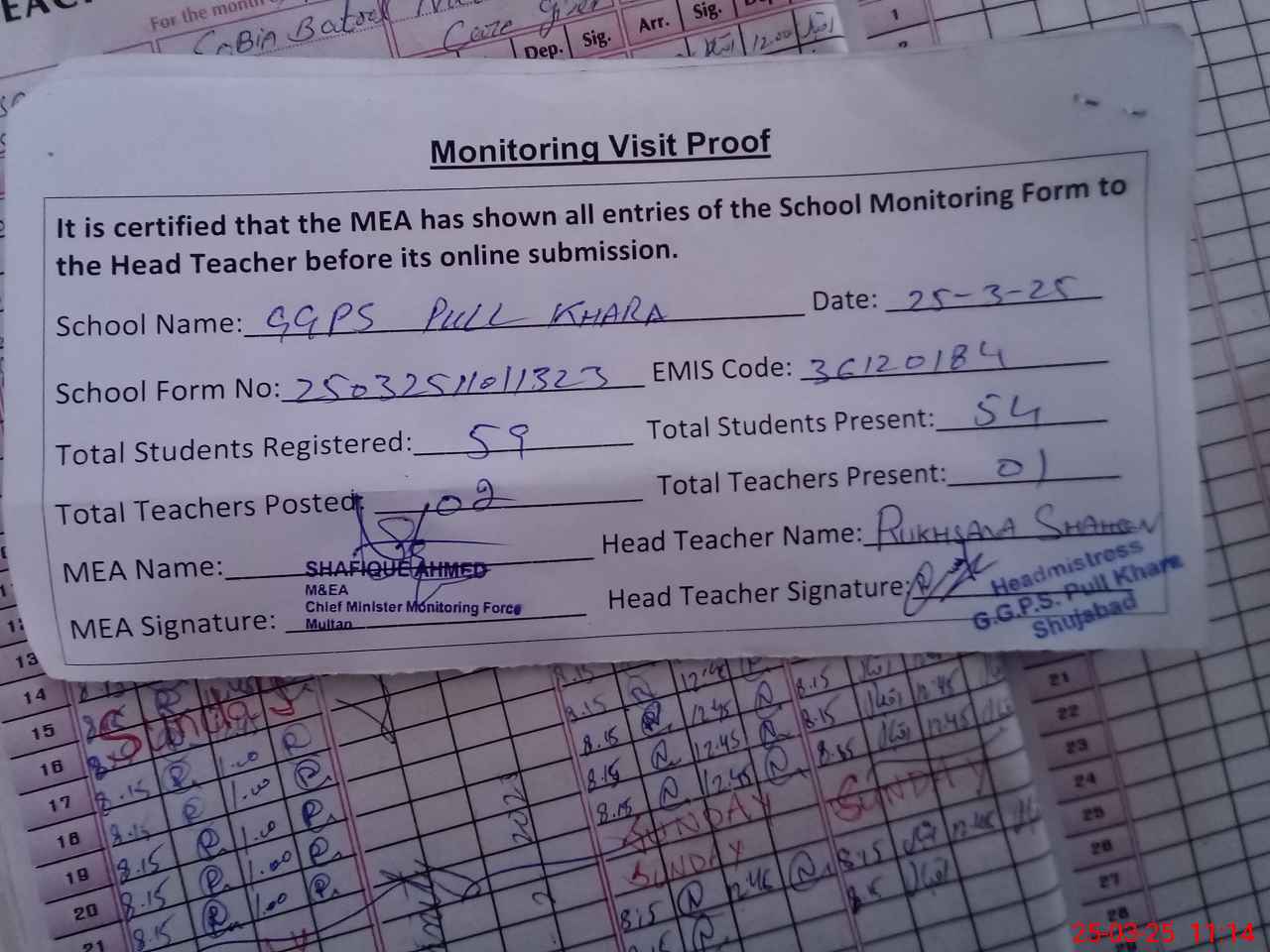| Attendance Register | Head Teacher | MEA with School | Visit Proof |