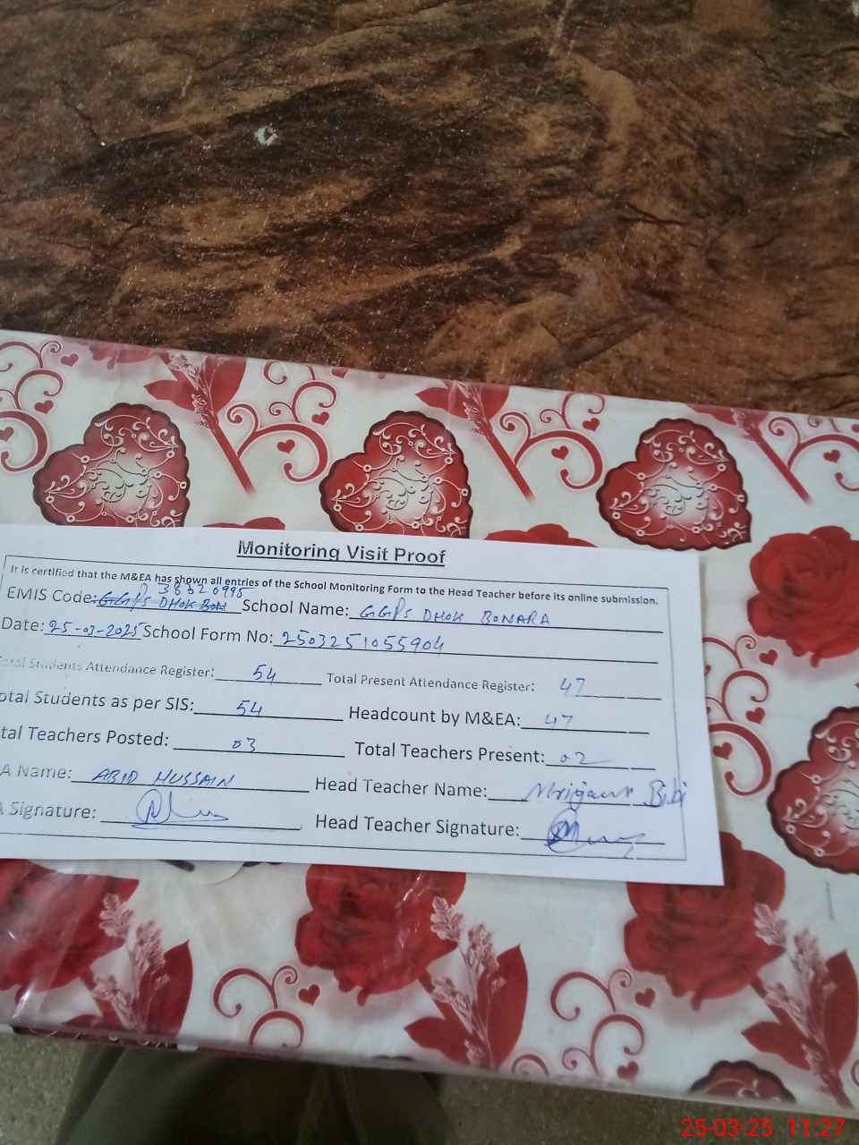 | Attendance Register | Head Teacher | MEA with School | Visit Proof |