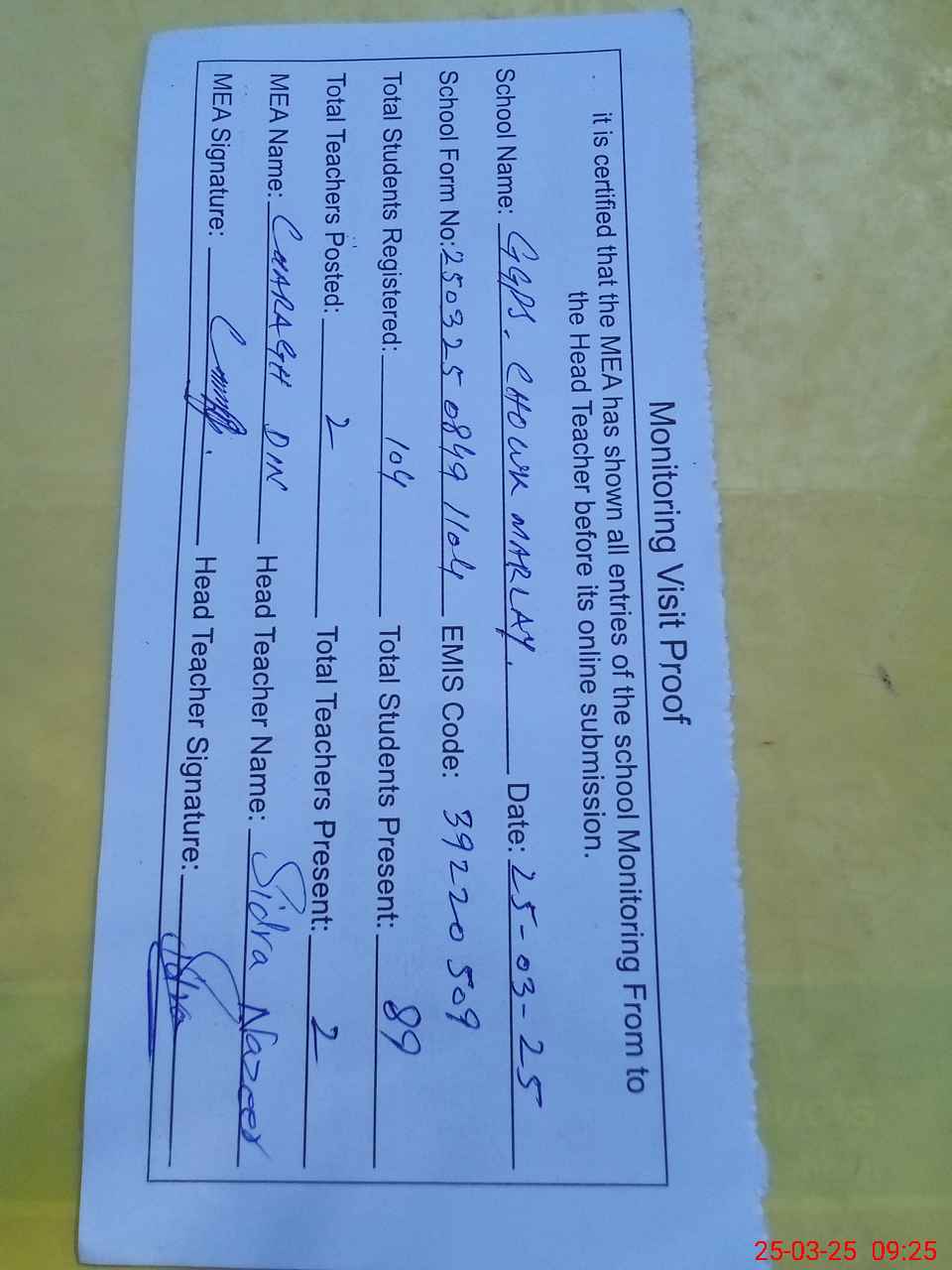 | EMIS Code: 39220509 | Name of School: GGPS CHOWK MARLAY | |||