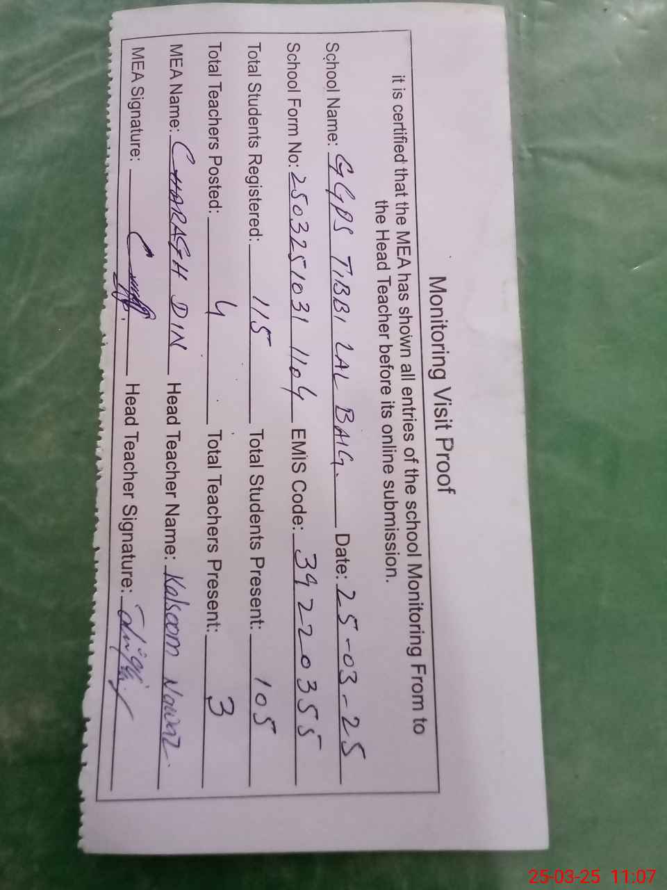 | Attendance Register | Head Teacher | MEA with School | Visit Proof |