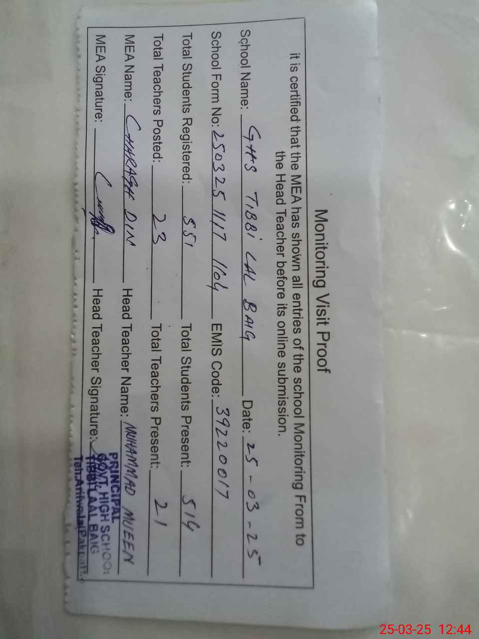 | Attendance Register | Head Teacher | MEA with School | Visit Proof |