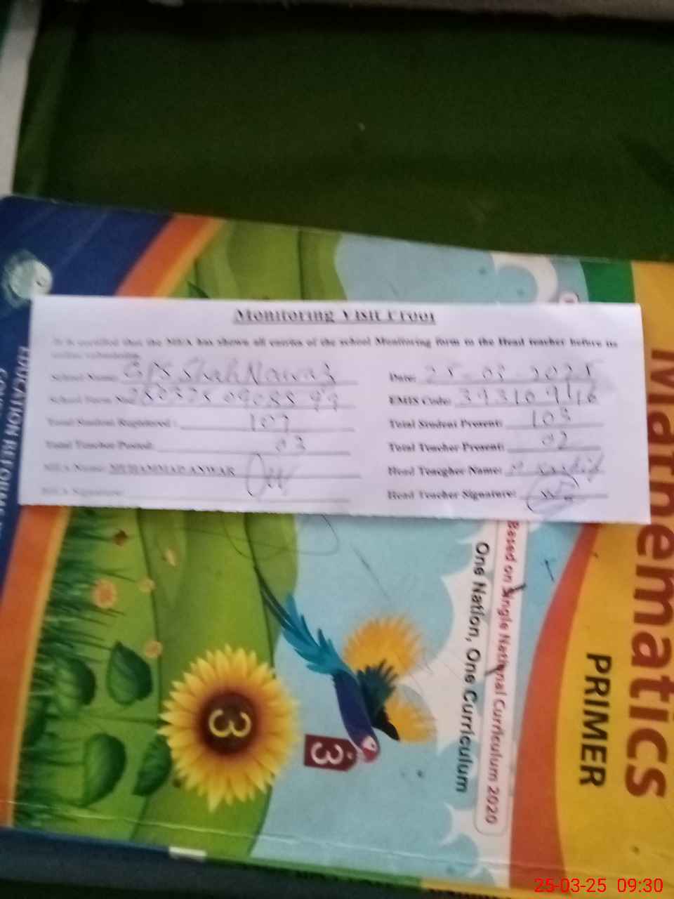 | Attendance Register | Head Teacher | MEA with School | Visit Proof |