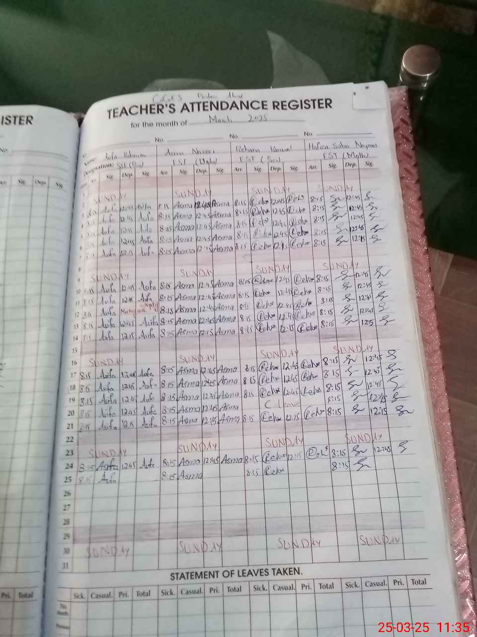 | Leave | Duty | Absent | Maternity | Medical | Ex- Pak |