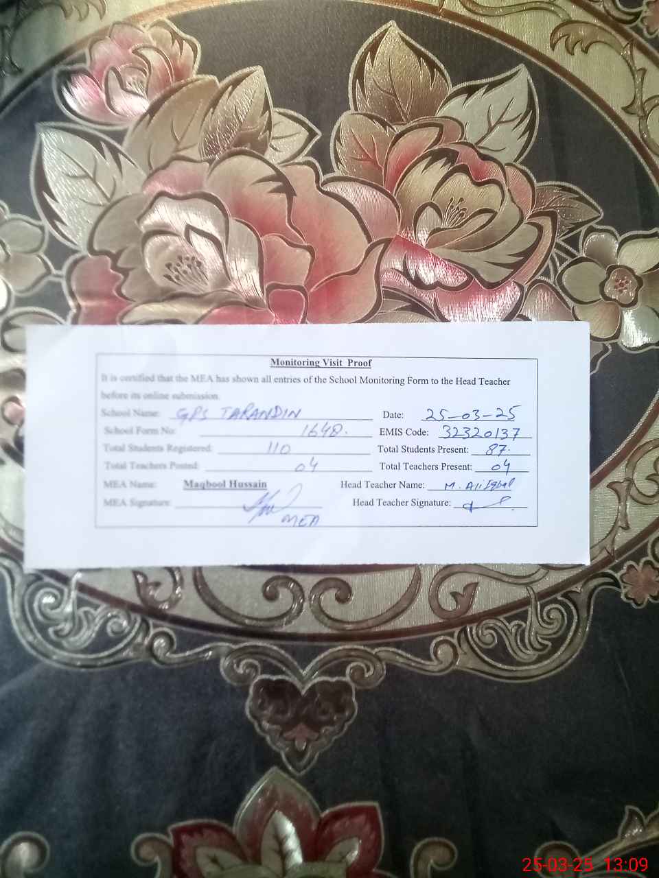 | Attendance Register | Head Teacher | MEA with School | Visit Proof |