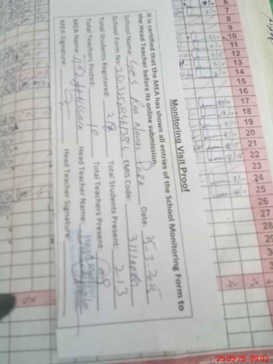 | Attendance Register | Head Teacher | MEA with School | Visit Proof |
