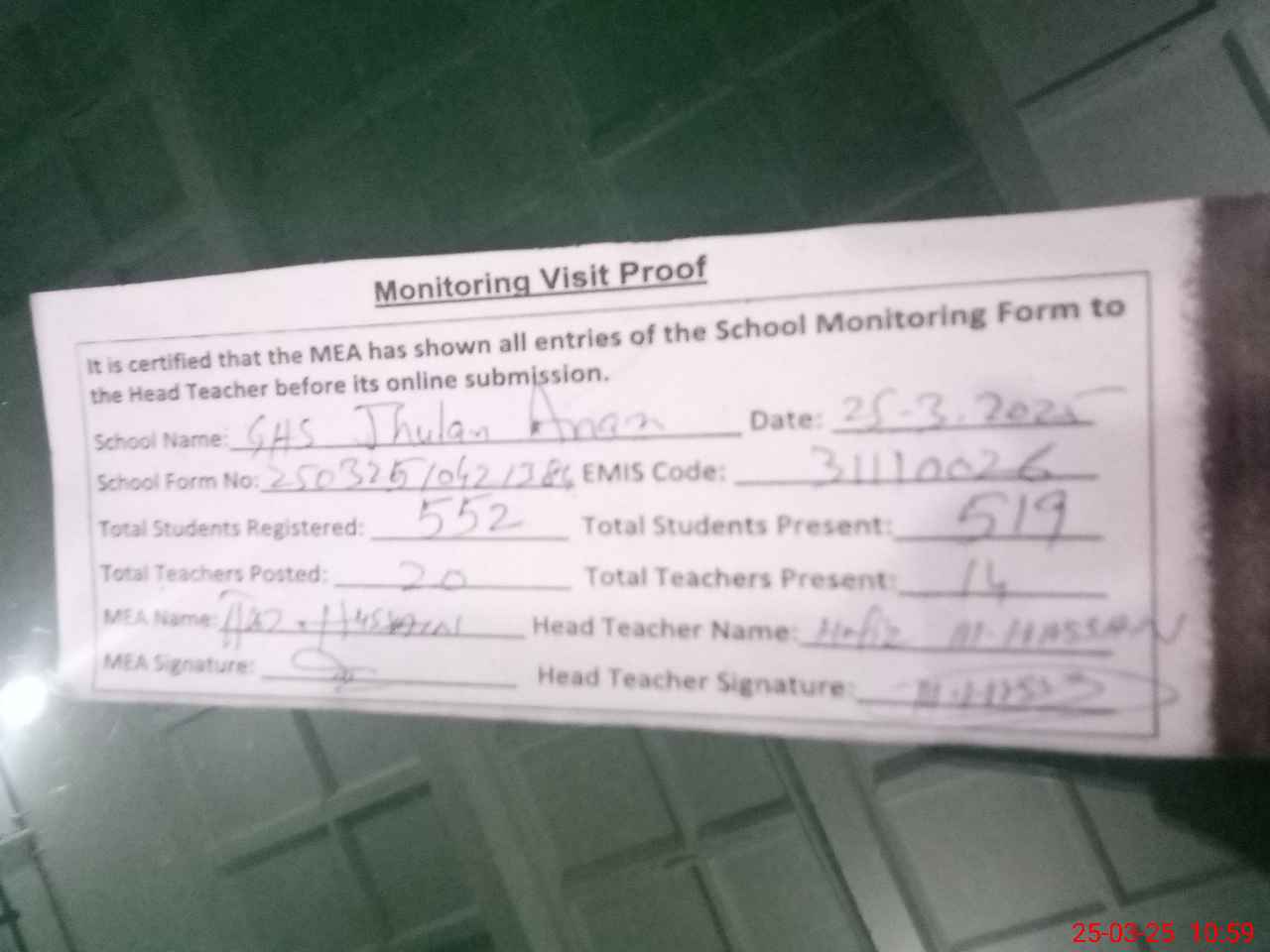 | EMIS Code: 31110026 | Name of School: GHS JHULLAN ARAIN | |||