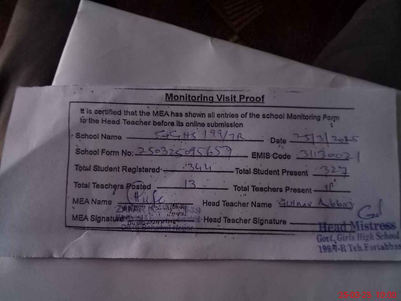 | Attendance Register | Head Teacher | MEA with School | Visit Proof |