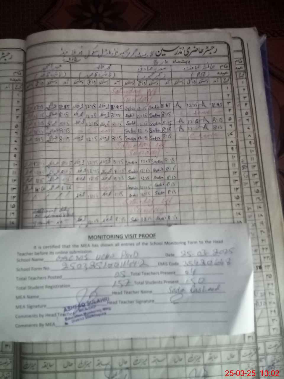 | Attendance Register | Head Teacher | MEA with School | Visit Proof |