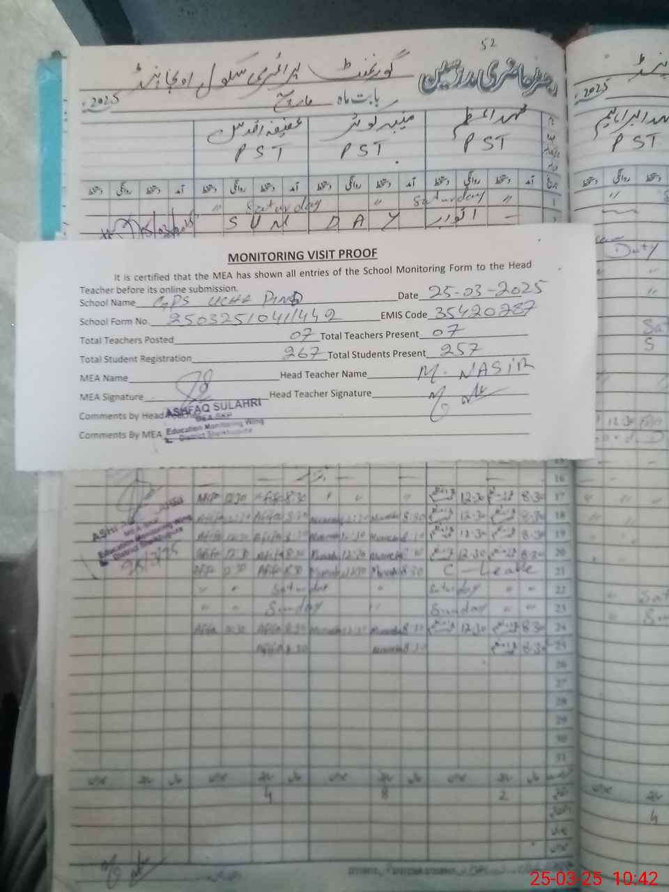 | Attendance Register | Head Teacher | MEA with School | Visit Proof |