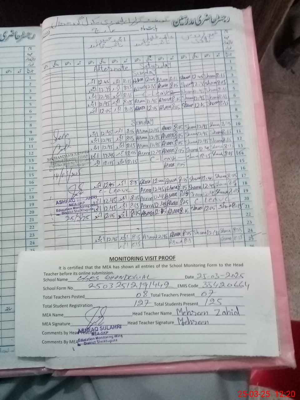 | Attendance Register | Head Teacher | MEA with School | Visit Proof |
