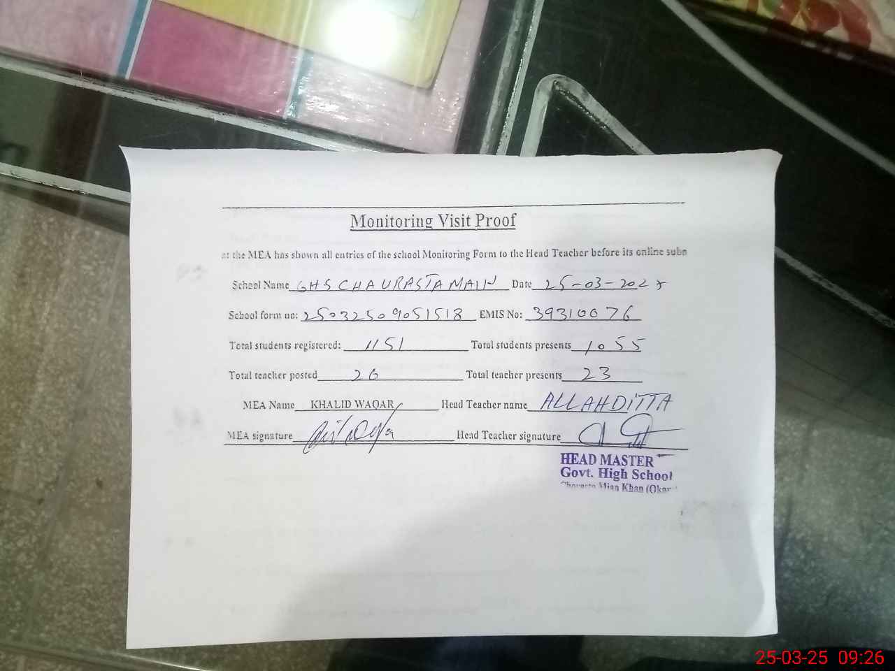 | Attendance Register | Head Teacher | MEA with School | Visit Proof |