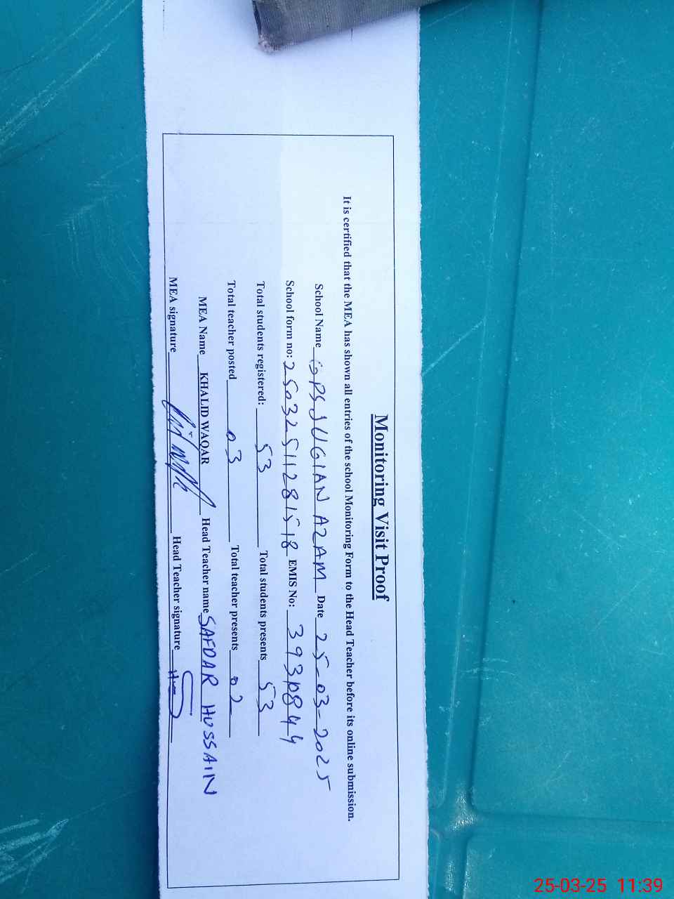 | Attendance Register | Head Teacher | MEA with School | Visit Proof |