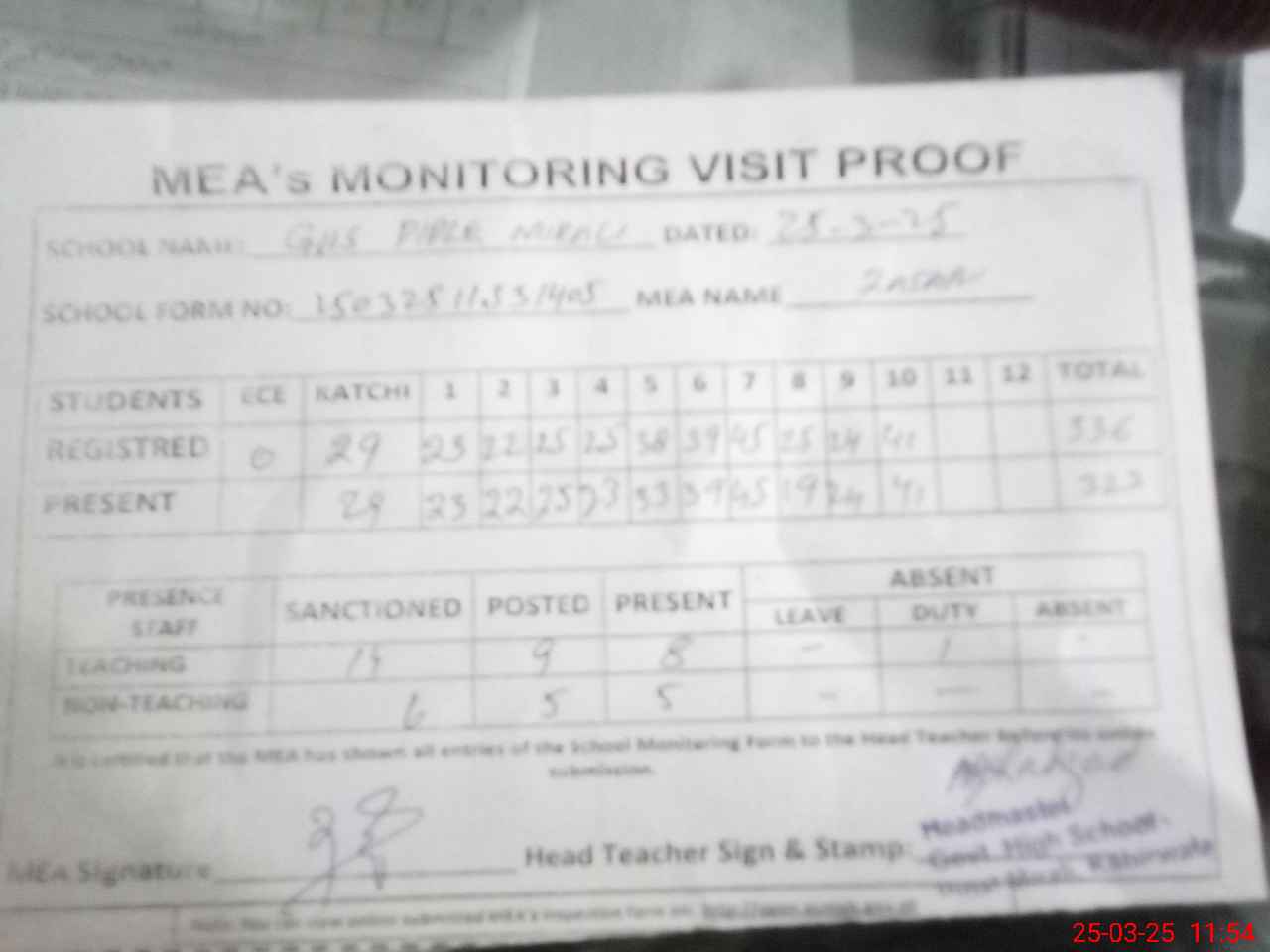 | Attendance Register | Head Teacher | MEA with School | Visit Proof |