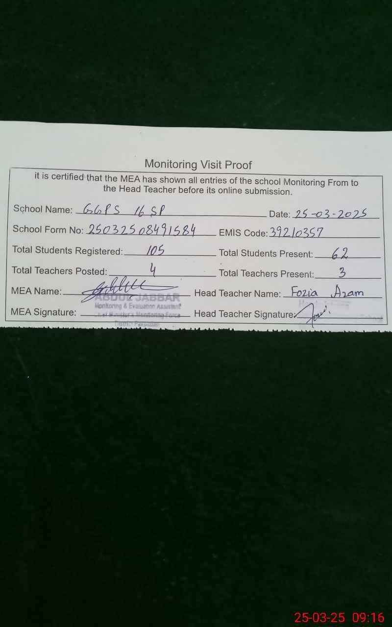 | EMIS Code: 39210357 | Name of School: GGPS 16 SP | |||