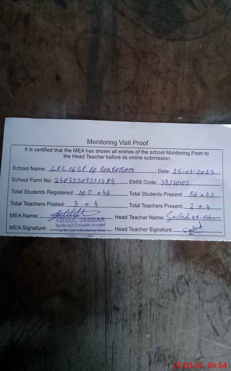 | EMIS Code: 39210105 | Name of School: GPS 16/SP PO PAKPATTAN | |||