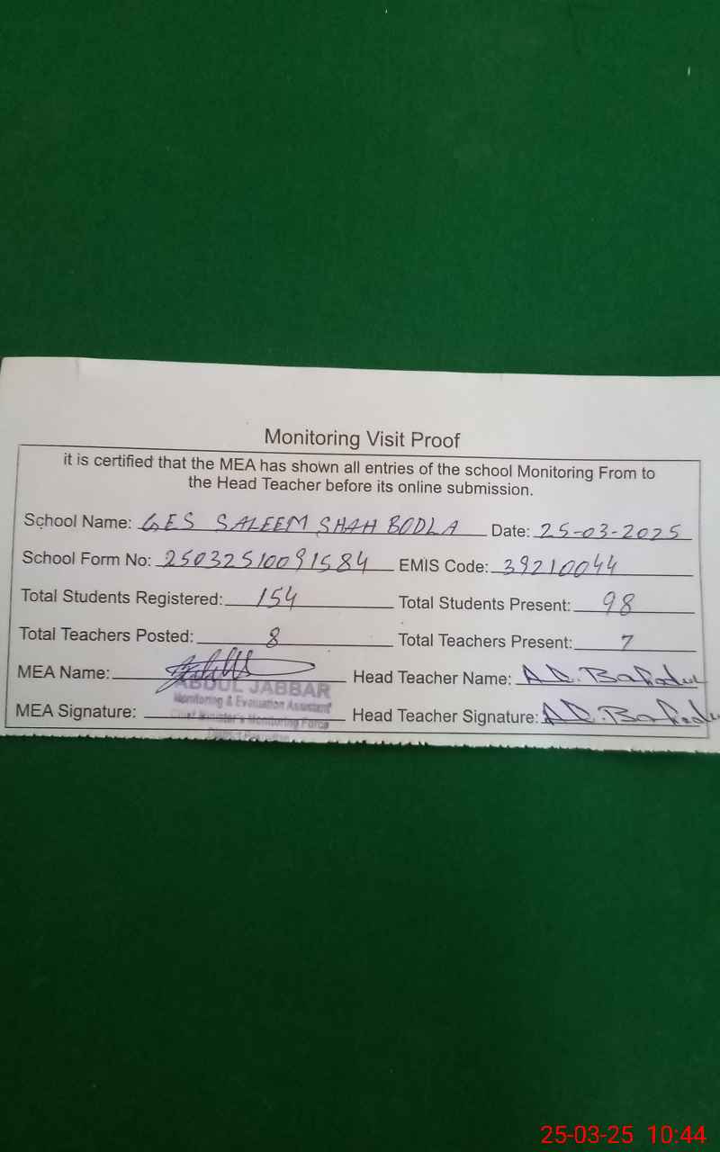 | EMIS Code: 39210044 | Name of School: GES SALEEM SHAH BODLA | |||