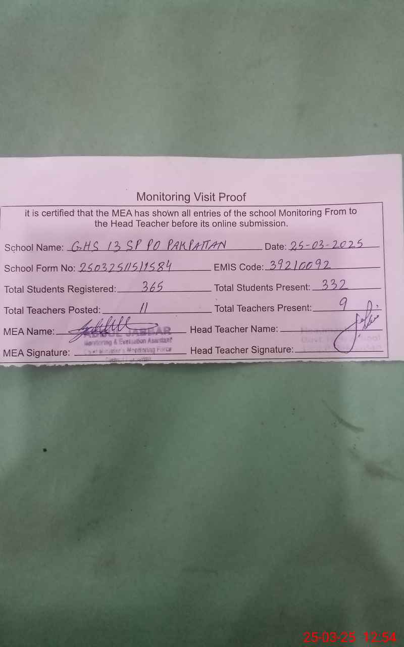 | EMIS Code: 39210092 | Name of School: GHS 13/SP P.O PAKPATTAN | |||