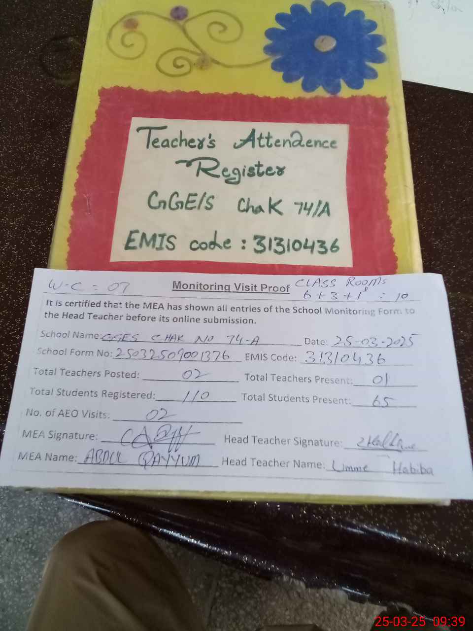 | Attendance Register | Head Teacher | MEA with School | Visit Proof |