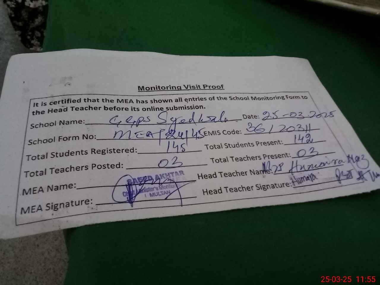 | Attendance Register | Head Teacher | MEA with School | Visit Proof |