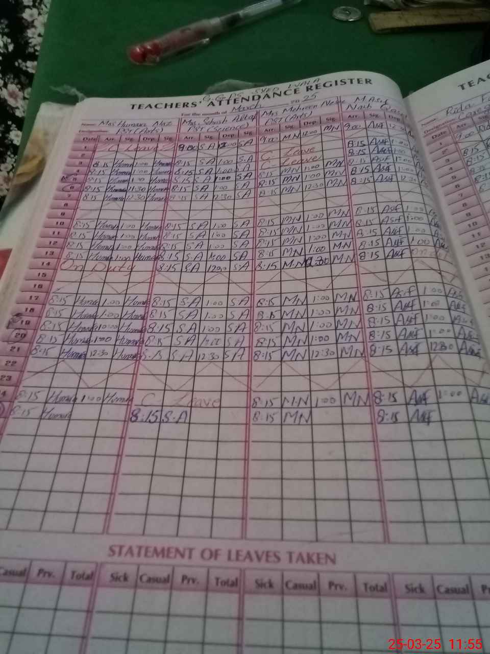 | Leave | Duty | Absent | Maternity | Medical | Ex- Pak |