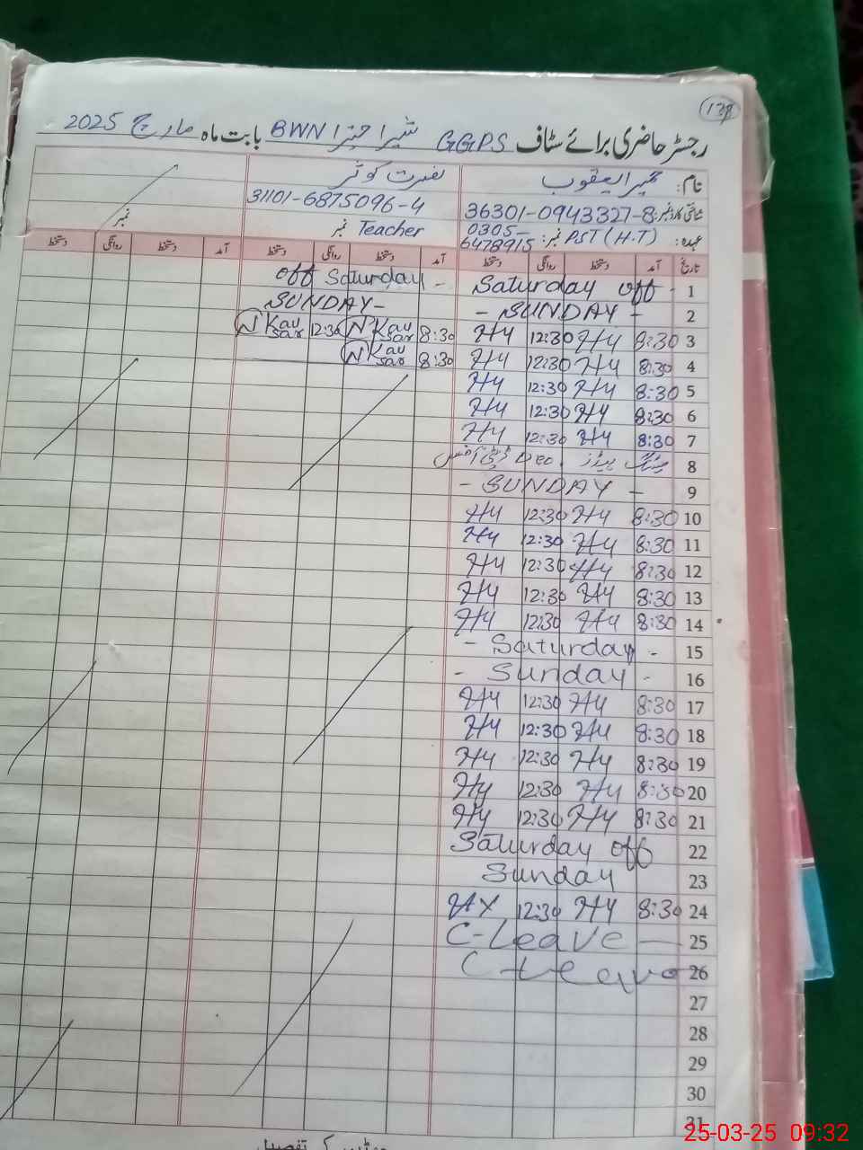 | CNIC | Full Name | Designation | R/C | Absence during last cal. month |