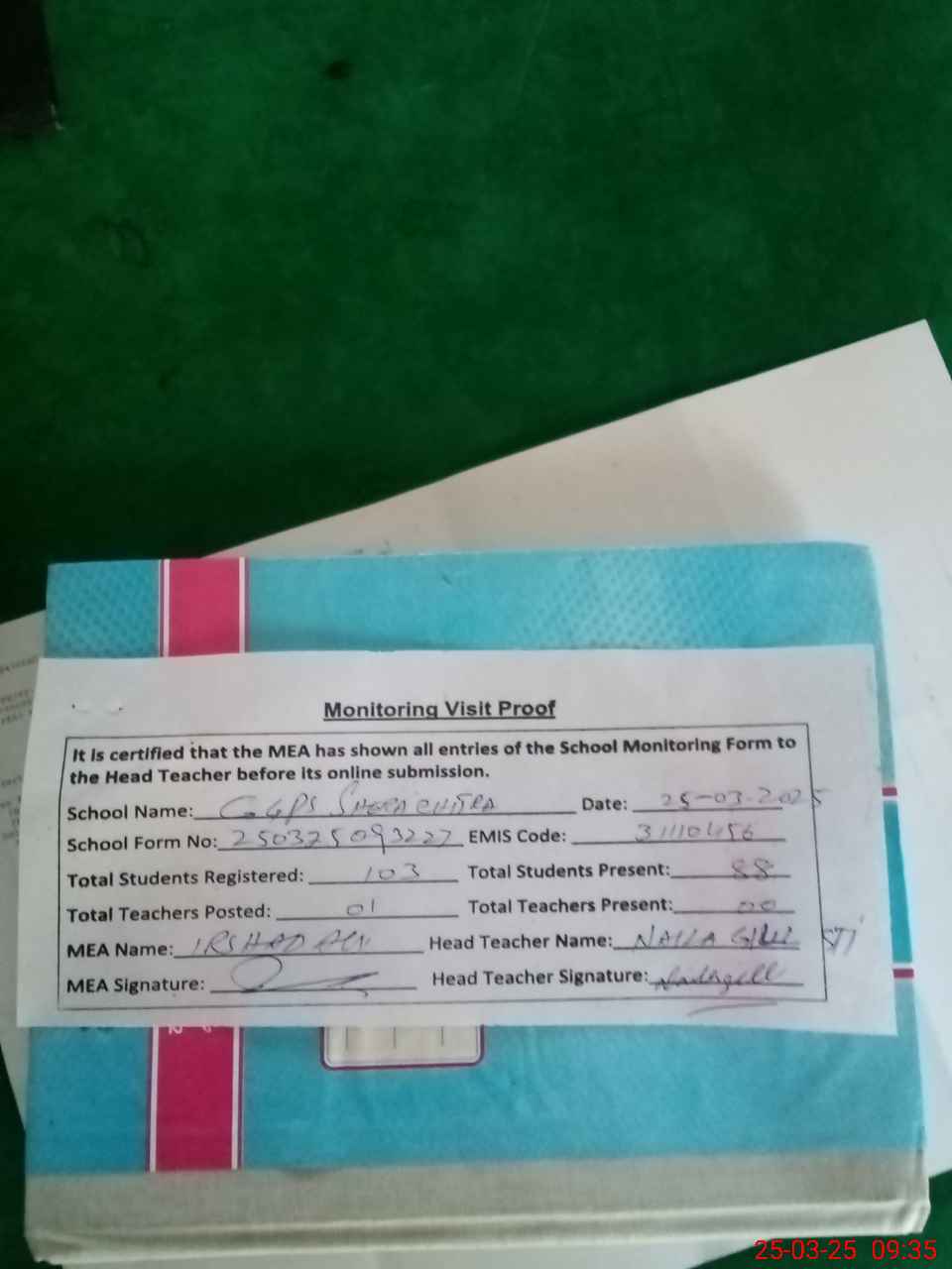 | Attendance Register | Head Teacher | MEA with School | Visit Proof |