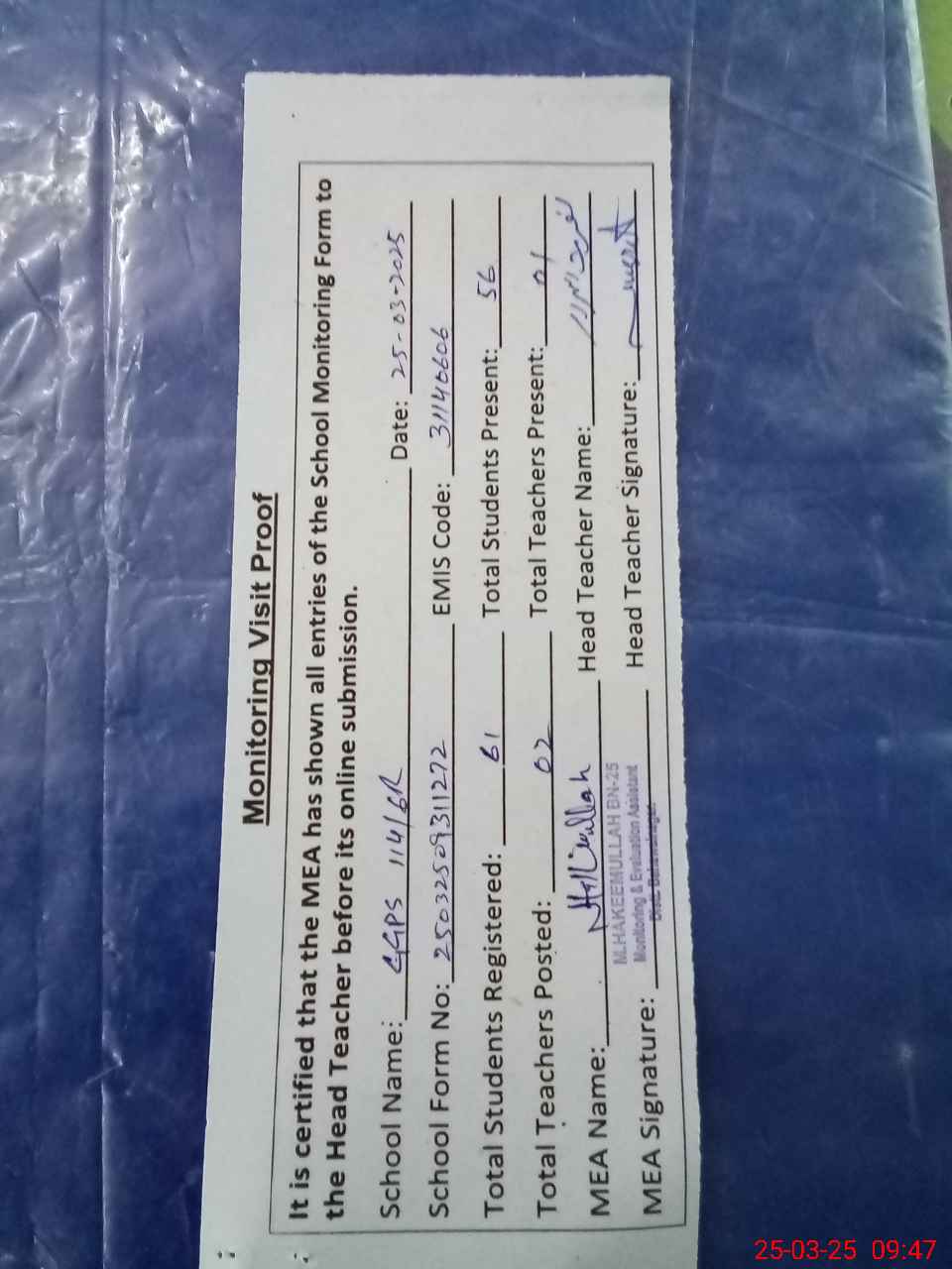 | EMIS Code: 31140606 | Name of School: GGPS CHAK NO. 114/6-R | |||