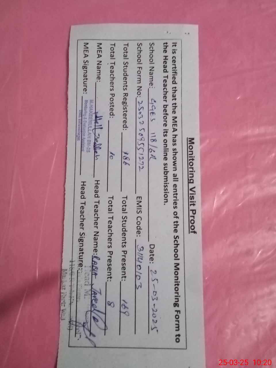 | Attendance Register | Head Teacher | MEA with School | Visit Proof |