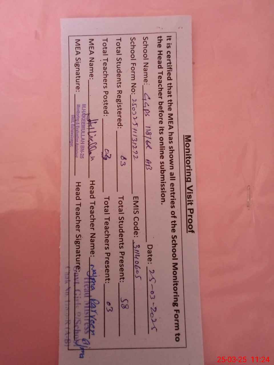 | Attendance Register | Head Teacher | MEA with School | Visit Proof |