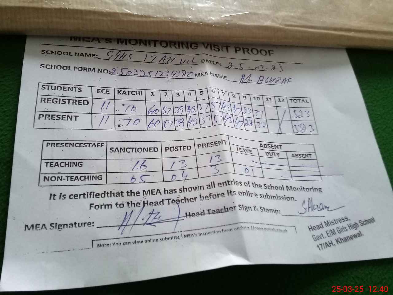 | Attendance Register | Head Teacher | MEA with School | Visit Proof |