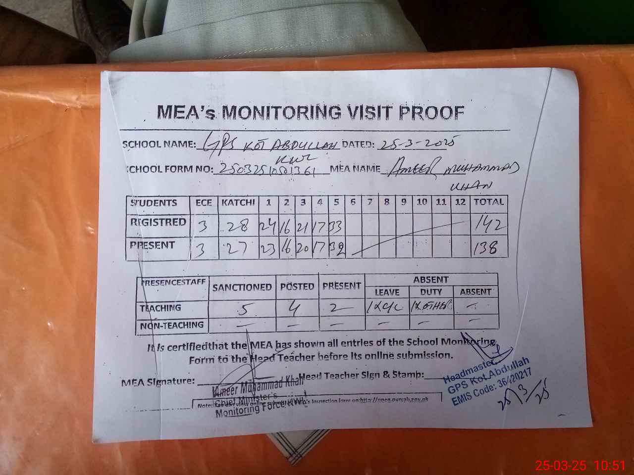 | EMIS Code: 36420217 | Name of School: GPS KOT ABDULLAH, P/O MAKHDOOM PUR, KHANEWAL | |||