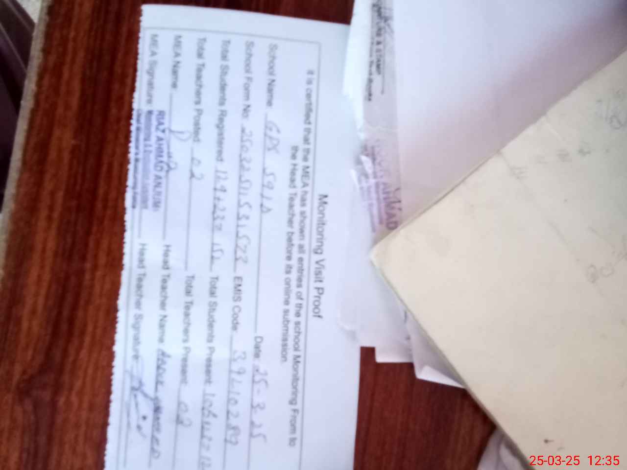 | Attendance Register | Head Teacher | MEA with School | Visit Proof |