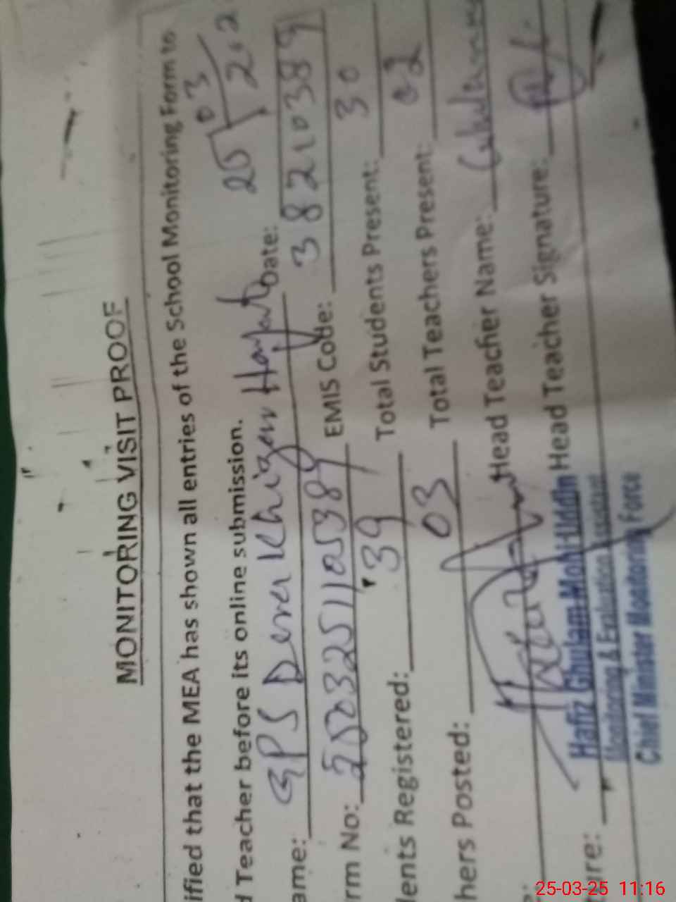 | EMIS Code: 38210389 | Name of School: GPS DERA KHIZAR HAYAT | |||