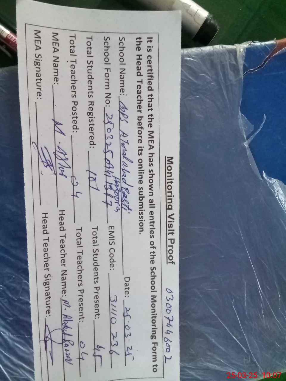 | Attendance Register | Head Teacher | MEA with School | Visit Proof |