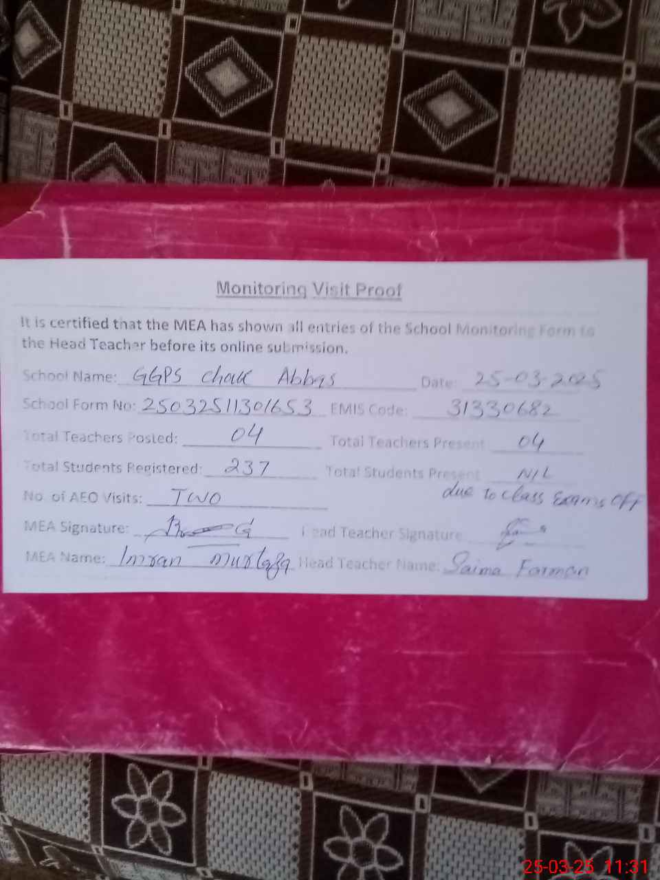 | EMIS Code: 31330682 | Name of School: GGPS CHAK ABBAS | |||